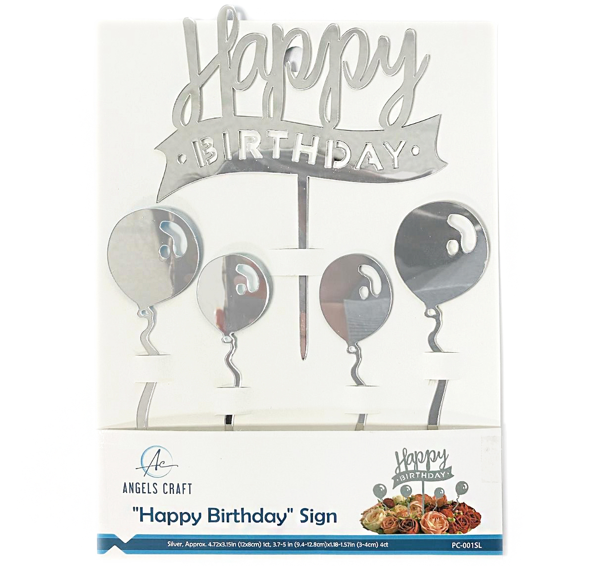 Sign "Happy Birthday"-Silver, Approx. 4.72x3.15in (12x8cm) 1ct, 3.7-5 in (9.4-12.8cm)x1.18-1.57in (3-4cm) 4ct
